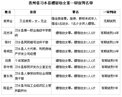 其中,被告人馮支洋(習水縣第一職業(yè)高級中學教師)嫖宿幼女2人3次;被告人陳村(習水縣同民鎮(zhèn)司法所干部)嫖宿幼女1人2次;被告人母明忠(習水縣人大代表、利民房地產(chǎn)開發(fā)公司經(jīng)理)嫖宿幼女2人2次;被告人馮勇(個體駕駛員)、李守明(習水縣移民開發(fā)辦公室主任)、黃永亮(習水縣人事勞動和社會保障局干部)、陳孟然(習水縣馬臨工業(yè)經(jīng)濟區(qū)土管所副所長)分別嫖宿幼女1人1次。