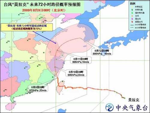 預(yù)計(jì),“ 莫拉克 ” 將以每小時10公里左右的速度向北偏西方向移動,并將于今天下午到夜間在福建連江到浙江樂清一帶沿海登陸。