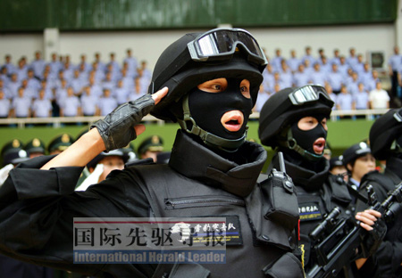在最繁華的西單商業街,出現了戴著墨鏡的特警。8月22日,國慶安保巡邏防控啟動儀式在這里進行,百余名由特警、民警、保安組成的巡邏隊伍,在鬧市街頭巡邏。這著實讓百姓們開了把眼界。“剛看到時有一絲緊張,”當天,正在西單逛街的彭女士說:“但覺得很安全,畢竟是國慶嘛。”