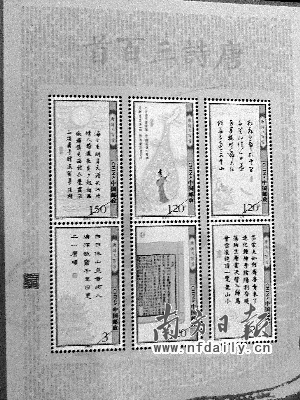 昨日省郵政公司表示,為慶祝共和國成立60周年,弘揚中國傳統(tǒng)文化,中國郵政將于本月13日發(fā)行“世界上首套多媒體郵票”———《唐詩三百首》(見左圖,楊小亮攝)。此套郵票一套共6枚,全套面值9元。