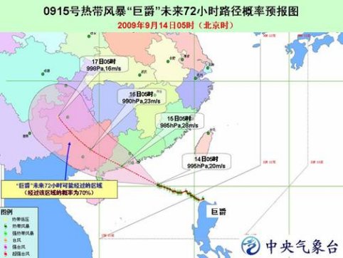 中新網9月14日電 中央氣象臺今日06時發布臺風橙色警報:今年第15號熱帶風暴“巨爵”(Koppu ,名字來源于日本,指巨爵星座)的中心今天早晨 5 時位于廣東陽江東南方大約 480 公里的南海北部海面上,就是北緯20.1度、東經116.2度,中心附近最大風力有9級(23 米/秒)。