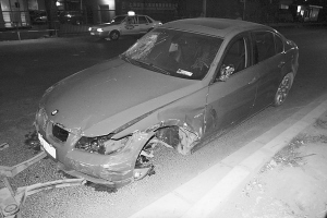 在滬南路陳春路口,這輛“瘸了腿”的牌號為滬G16281的紅色寶馬轎車仍停在路邊,右前擋風玻璃已碎成網狀,據說這是騎車人被撞后彈到擋風玻璃上所留下的。車的左前輪已不見蹤影……幾名目擊者回憶起事發經過:由于滬南路正在拓寬,相向行駛的車輛公用北向南車道,地上劃有清晰的區分標識。誰料,這輛本應是由南向北行駛的寶馬車,竟駛上了北向南車道上,“當時‘寶馬’速度很快,直接就把那輛正常行駛的電動車撞了。”寶馬車將騎車人撞飛后,并未停車,而是繼續逆向前行,又與一輛相向行駛的銀色帕薩特轎車發生碰撞。