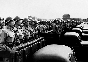 1949年10月1日開國大典,因?yàn)槿姏]有統(tǒng)一的服裝,按照閱兵指揮部的要求,受閱的陸軍部隊(duì)全部著黃綠色軍裝,頭戴鋼盔,帽徽為“八一”紅五星,左胸前佩戴印有“中國人民解放軍”字樣的長方形胸章。受閱的海軍方隊(duì),干部戴白色大檐帽,扎白色腰帶;戰(zhàn)士戴白色水兵帽,腦后飄動著兩條黑色緞帶,身著藍(lán)白相間的海魂服。空軍飛行員身著飛行服駕機(jī)受閱。受閱的女兵則穿著黃色的連衣裙。