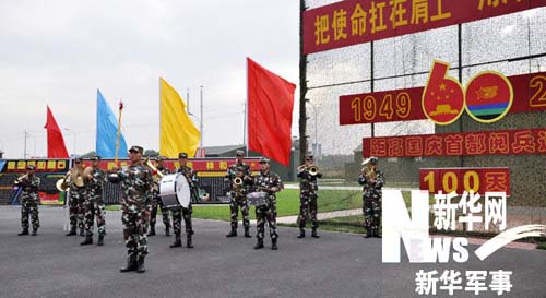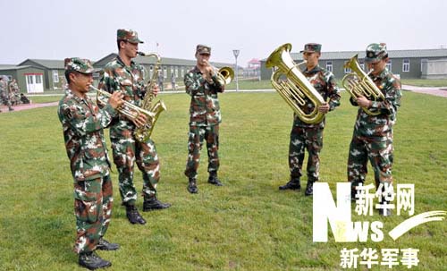 進駐閱兵村后,為豐富官兵文化生活需要,方隊緊急組建了這支小型軍樂隊,配備了大小號、長圓號、大小軍鼓等各種管弦和打擊樂器。雖然樂隊成員只有10人,卻個個藝精才高。他們有的畢業于藝術學校,民樂、西洋管樂樣樣皆通;有的來自嗩吶世家,"童子功"相當深厚;還有的是國家一級演員的弟子,快板說得頭頭是道……個個都是方隊的文藝骨干。這支軍樂隊也成了方隊的文藝演出小分隊。