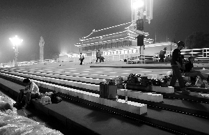 測(cè)量、吊線、打眼、擰螺絲……昨日下午5時(shí)許,天安門(mén)城樓前東西兩側(cè)臨時(shí)觀禮臺(tái)的紅地毯上,工人正將一排排乳白色“木盒”與地面固定。