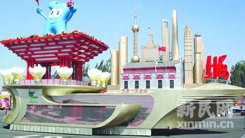 這輛名為“騰飛上海”的彩車(chē)長(zhǎng)15米、寬6米,猶如一艘破浪前行的金色航船,船首是中共一大會(huì)址的建筑造型,背后是浦江兩岸的高樓大廈,后方為上海世博會(huì)中國(guó)館,上面有海寶揮舞國(guó)旗和鮮花,整個(gè)造型突出“上海背景,世博主題”,象征著上海乘風(fēng)破浪,朝著建設(shè)國(guó)際金融中心和國(guó)際航運(yùn)中心的目標(biāo)快速前進(jìn)。