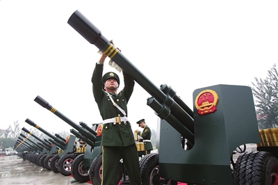 當天上午9時30分,武警北京總隊某部京郊某訓練場。秋雨剛過,訓練場上的60門禮炮(其中4門為預備炮)著新刷不久的綠漆,雁翅分開,昂然而立。9時40分左右,“就炮!”隨著一聲口令,百余名武警戰士兩人一組站到禮炮后面。