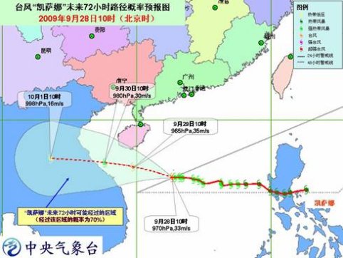 受“凱薩娜”及其外圍云系的影響, 28 日中午到 29 日中午 ,南海大部海面、北部灣海面、海南沿海、瓊州海峽將有 7~9 級大風,“凱薩娜”中心經過的附近海面的風力將有 10~12 級大風,陣風可達 13~15 級;巴士海峽、巴林塘海峽、臺灣海峽、臺灣以東海面、廣東沿海、福建中南部沿海、廣西沿海也將有 6~7 級大風,陣風可達 8~9 級; 浙江東部沿海、福建東部沿海、臺灣南部、廣東南部、海南大部有大雨或暴雨,海南東部的局部地區有大暴雨。