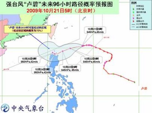 中新網(wǎng)10月21日電 中央氣象臺21日6時發(fā)布臺風(fēng)預(yù)報:今年第20號強臺風(fēng)“盧碧”將以每小時10-15公里的速度向西偏南方向移動,逐漸向菲律賓呂宋島北部沿海靠近,強度變化不大。