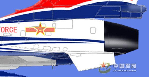 殲-10表演機的機徽與空軍軍機機徽相同,為軍徽兩邊襯一鑲有對稱的金黃色等邊的紅帶,中間嵌金黃色“八一”二字,“八一”為宋體漢字。噴涂在機身后部左右兩側、左右機翼上表面,共4處(見圖7、8、9)