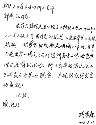 郭燕紅迫不及待地打開信。信中用藍墨水鋼筆工工整整寫道:“航天工業總公司23所工藝師郭燕紅同志:我寫這封信是因為讀了《科技日報》1996年3月12日8版上肖巖的報道《追求卓然》而很感動!想您初到航天領域工作時,我早已退出第一線了;但對您所負責工作的重要性還是有認識的。所以我要對您這位工藝師表示由衷的敬意!并祝您取得更高的成就!錢學森”。