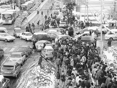 但北京市的公共交通系統(tǒng)仍舊要經(jīng)受大雪的考驗(yàn)。記者發(fā)現(xiàn),早上8點(diǎn)半時(shí)五道口城鐵站附近的路面上已無(wú)積雪,車(chē)輛行駛較為通暢。但路邊的積水給從城鐵站和公交車(chē)站走出的上班族帶來(lái)了麻煩,他們小心翼翼地嘗試尋找積水可能比較淺的落腳點(diǎn),行進(jìn)速度緩慢,經(jīng)常堵住了垂直方向的車(chē)流。現(xiàn)場(chǎng)指揮的交警不停地大聲呼喊著疏導(dǎo)人流和車(chē)流,但他的聲音卻總被喇叭聲淹沒(méi)。直到10點(diǎn)多,五道口才基本恢復(fù)了原來(lái)的秩序,整個(gè)早高峰被這場(chǎng)大雪拉長(zhǎng)了。