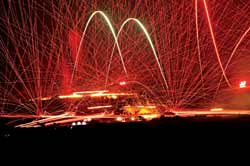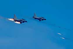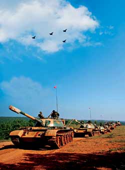 記者在演習現場看到,在某高地的爭奪戰中,紅藍雙方拼得異常激烈。拂曉剛過,“藍軍”15架飛機從多個方向同時出現在“紅軍”空域,準備對“紅軍”目標同時發起攻擊。“紅軍”毫不示弱,偵察飛機主動出擊,出其不意地對敵情報預警系統實施欺騙性干擾,與此同時,“紅軍”空中攔截兵力強行突防飛抵目標上空,朝敵機猛撲過去,為奪取局部制空權,與敵機展開了一場生死大戰。瞬間,方圓數百公里的戰場陡然升溫。爾后,“紅軍”空中轟炸機群多批次、多架次、不間斷對敵縱深目標進行持續轟炸,使敵指揮機構、通信樞紐等重要目標遭到癱瘓性打擊。