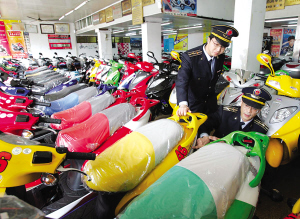 在長寧路一家銷售店內,擺放著36輛電動自行車,其中20輛的重量超標。銷售人員說:“一般只有裝鋰電池的車不超標,要想達標,除非稱重時拿掉電瓶!