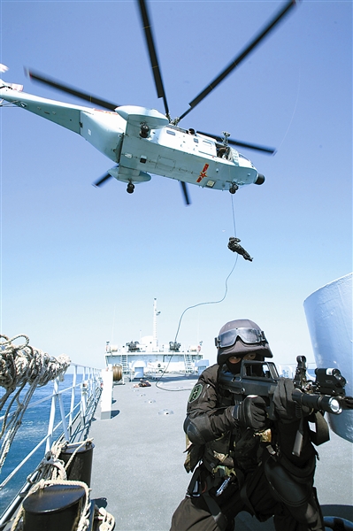 “報告!發現疑似海盜船尾隨商船船隊!”航行在亞丁灣海域的海軍第四批護航編隊迅即進入一級反海盜部署:海軍特戰隊員奉命隨船護衛,直升機飛臨商船上空懸停,4名特戰隊員敏捷地滑降到商船上,進入高度戒備狀態。