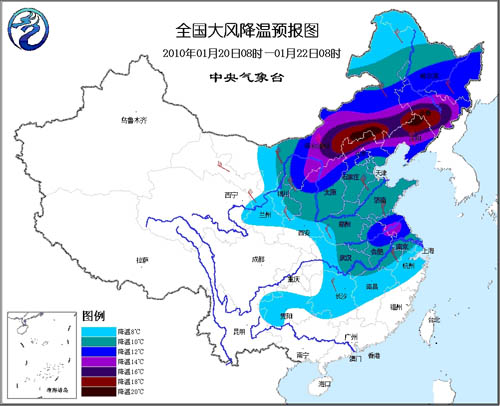 20日14時至22日14時,西北地區東部、內蒙古大部、華北、東北、黃淮、江淮、江漢、江南北部、貴州等地自西向東、自北向南將先后有4~6級、陣風7級偏北風;上述地區的氣溫將下降8~12℃,其中,內蒙古中東部、華北北部、東北地區中南部、江淮東部等地降溫幅度可達14~16℃,內蒙古中部、東北地區東南部的部分地區降溫達18~20℃。