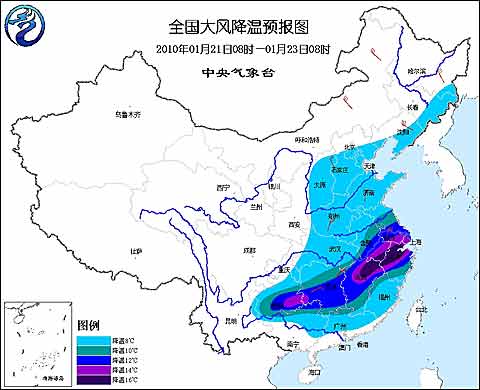 21日08時至23日08時,華北中南部、東北東南部、黃淮、江淮、江漢、江南等地將先后有4~6級、陣風7級偏北風;上述地區(qū)及華南北部、貴州等地的氣溫將下降8~10℃,其中,江淮南部、江南北部、貴州東部等地降溫幅度可達12~14℃,局部地區(qū)降溫達14~16℃。22日早晨,內(nèi)蒙古東北部、東北地區(qū)中北部的最低氣溫將達零下30至零下35℃,局地零下40℃;華北中南部、山東等地最低氣溫在零下9至零下14℃,黃淮南部和西部最低氣溫在零下4至零下6℃,江淮、江南北部最低氣溫在零下3至0℃。