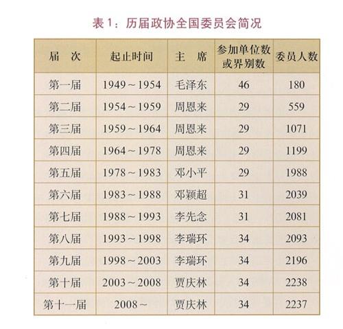 政協全國委員會每屆任期五年,設主席、副主席若干人、秘書長。歷屆政協全國委員會簡況如表1。