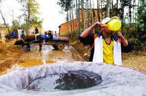 芳華鎮(zhèn)雙合村口,朱家付牽著牛車擠在人群中。黃牛拉著一個(gè)銹跡斑斑的鐵桶,那是全家用水的希望。抽上來(lái)的水不時(shí)的灑到人們身上,孩子們嬉笑著。