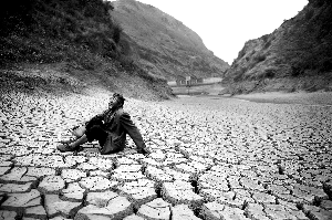 昨日,云南省曲靖市羅平縣牛街河水電站,一名放羊的村民坐在干枯的河床上休息。本報記者 李強 攝