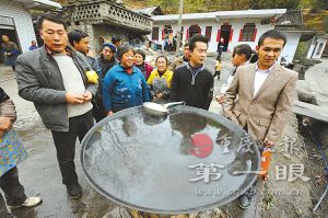 納雍縣少數(shù)民族眾多,這對(duì)新人都是漢族,新郎叫嚴(yán)大朵,新娘叫榮美翼。為了舉行婚禮,半個(gè)多月前,專門(mén)在新郎家門(mén)口修了一個(gè)水池。全家人都省吃儉用,到處找水存進(jìn)這水池當(dāng)中,村子里其他鄉(xiāng)親也來(lái)幫忙。到婚禮舉辦的前一天,兩米見(jiàn)方的水池終于全部裝滿。家里又找了幾口大鐵鍋,裝滿清水備用。