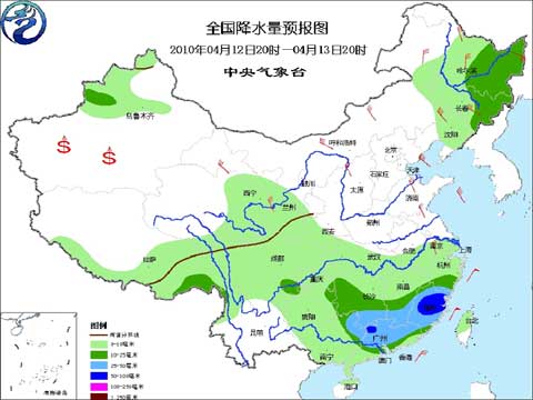 中央氣象臺2010年4月12日17時發布未來三天全國天氣預報: