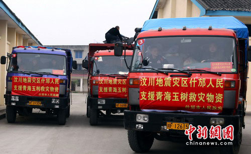 中新網(wǎng)什邡4月16日電(記者楊杰)16日上午,首批3輛滿載著代表“5.12”地震極重災(zāi)區(qū)什邡人民深情厚誼的捐贈(zèng)救災(zāi)物資車輛,從什邡市啟程,開(kāi)始奔赴青海玉樹(shù)災(zāi)區(qū)。