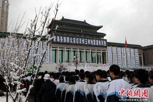 2010年4月21日上午10時,在青海省府西寧市最大的廣場——新寧廣場,各界民眾手捧鮮花,佇立在風雪中,沉痛悼念玉樹大地震遇難者。