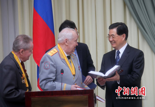 胡錦濤向俄羅斯老戰士們發表講話,并向他們頒發“和平”獎章和證書。