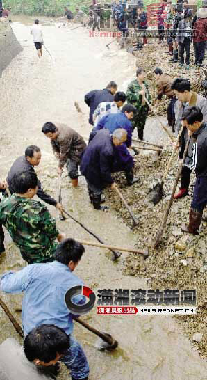 “嗨喲!嗨喲!”16日上午,溆浦縣千工壩灌溉干渠沿線喊聲震天,千余名當地群眾對這條懷化地區最大的引水工程進行了搶修。