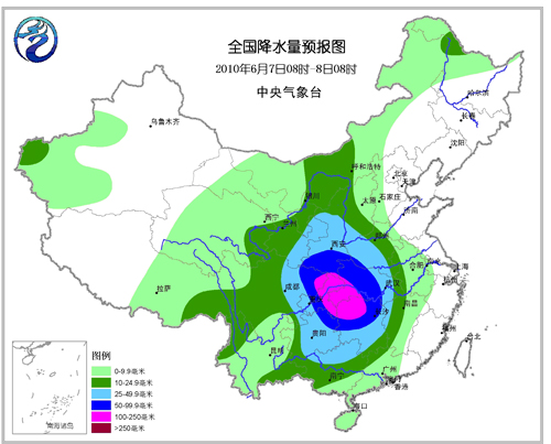 6月7日,新疆大部、西藏中部、甘肅西部、青海西部、內(nèi)蒙古大部、黑龍江大部、吉林、遼寧、河北大部、山西北部、北京、天津、山東、江蘇、上海、浙江、江西、安徽東部、福建、廣東大部為多云到晴天氣;云南西部、廣西、海南有陣性降雨;大部分地區(qū)日最高氣溫在28~33℃之間。我國其余大部分地區(qū)有小到中雨,其中甘肅中東部、陜西、四川東部、重慶、貴州大部、湖北、湖南、河南西南部等地的部分地區(qū)有大雨,部分地區(qū)有暴雨,局地有大暴雨,并伴有短時(shí)雷雨大風(fēng)(圖1),日最高氣溫一般在22~28℃之間,天氣較為涼爽。