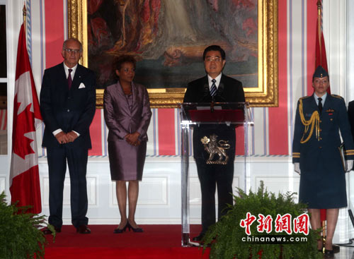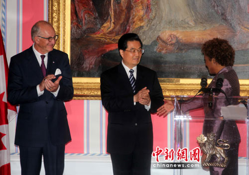 當地時間24日上午,正在這里進行國事訪問的胡錦濤在加拿大總督府會見加拿大總督米夏埃爾•讓。會見前,米夏埃爾•讓夫婦為胡錦濤的到訪舉行了隆重的歡迎儀式。米夏埃爾•讓還發表了熱情的歡迎辭。