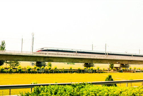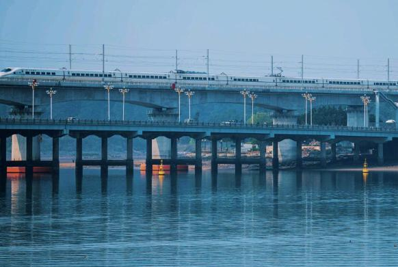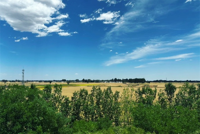 • 一望無際的麥田,呼嘯而過的高鐵,相互交織,譜成一首協奏曲。橋墩托舉鋼軌到天空,高鐵奔跑在藍天白云里。(投稿:黃勇)