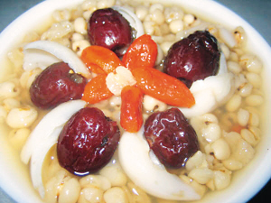 取薏仁米50g、百合15g、粳米100g、蜂蜜適量。將薏仁米、百合、粳米入鍋加水煮至熟爛,入蜂蜜調(diào)勻,出鍋即成。分2次服完。此粥有健脾益胃,澤膚祛斑功效。可用于治療婦女面部雀斑、痤瘡、濕疹等癥,對(duì)癰腫、濕瘡有治療效果。
