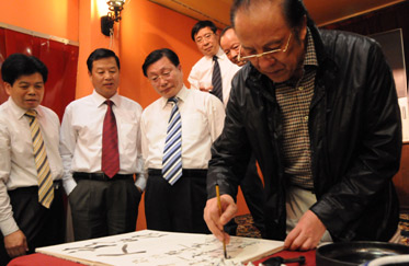晚宴上,著名歌唱家楊洪基揮毫灑墨,為阿根廷華人華僑聯合總會題字,代表團成員也一一落款簽字。