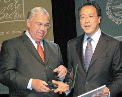中新網10月9日電 據美國《世界日報》報道,美國波士頓一年一度慶祝新移民和多元文化的慶典宴會“我們就是波士頓”(We are Boston),6日晚假波士頓會議中心舉行,900多名與會者向獲頒2009年度領袖獎的華裔大提琴家馬友友致敬。