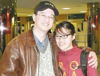歷劫歸來的陳如意(圖右),20日晚搭機抵達紐約,投入父親陳財興(圖左)的懷抱,并與家人分享此次海地行的點滴。 (美國《世界日報》∕傅家槿攝影)
