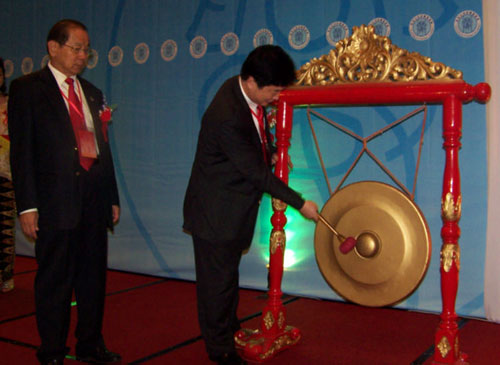 雅加達(dá)興安會(huì)館會(huì)長(zhǎng)關(guān)文龍帶領(lǐng)中共莆田市委書(shū)記楊根生上臺(tái)為今次第五屆世界興安同鄉(xiāng)懇親大會(huì)暨第五屆世界莆商大會(huì)鳴鑼示意,宣布大會(huì)的正式開(kāi)始。