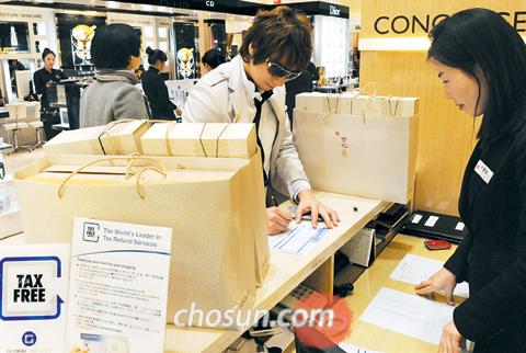 “這個肯定是真貨吧?”韓國首爾新世界百貨商店總店的外國人“退稅(tax refund)”柜臺前擠滿了中國人。一位顧客拿著一塊閃閃發光的名牌手表給百貨商店的漢語翻譯看并詢問。