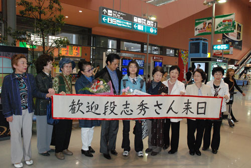 4月19日下午,北川女孩段志秀與李廣宏一起走下飛機,在關西機場,在此等候的日本友人向段志秀獻花,并鼓勵她在日本早日戰勝病魔,段志秀在機場說:“我要在日本學習很多有關抗震的知識,并打算將來到日本留學。”(渡邊)