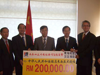 中新網(wǎng)5月6日電 據(jù)中國外交部網(wǎng)站消息,近日,馬來西亞馬中經(jīng)貿總商會、馬華公會公共服務及投訴局以及華商Yap Kim San 先生前來中國駐馬來西亞使館,轉交向青海玉樹地震災區(qū)捐款。