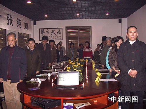 記者走進會議廳,一幅張純如的長發照片懸于廳堂,大學生們點燃一盞盞白色小蠟燭。每個人的座位邊,都整齊地擺放著一朵淡黃色菊花。