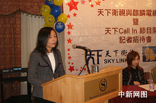 圖為麒麟電視總裁Nancy Li在當日的記者會上介紹麒麟電視與天下衛(wèi)視的合作。