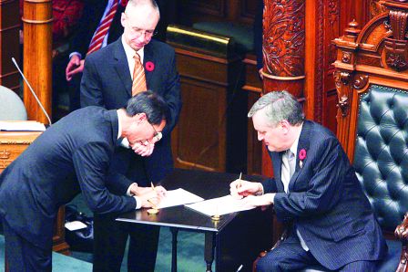 陳國治進行簽署儀式。(加拿大《明報》/李守銘 攝)