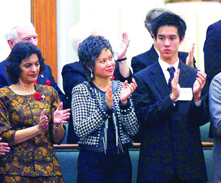 陳國治妻子陳余依齡和幼子陳俊瑯正為陳國治的新任命而鼓掌。(加拿大《明報》/李守銘 攝)