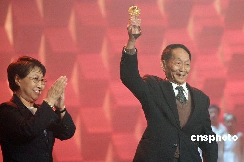 3月29日晚,“世界因你而美麗--2007影響世界華人盛典”頒獎(jiǎng)典禮,在北京大學(xué)百周年紀(jì)念講堂舉行。在科學(xué)研究、公共事務(wù)、體育競技、文化藝術(shù)等領(lǐng)域,榮獲“2007影響世界華人大獎(jiǎng)”的11位杰出華人揭曉。“雜交水稻之父”袁隆平榮膺“2007影響世界華人終身成就獎(jiǎng)”,全國人大常委會副委員長烏云其木格為其頒獎(jiǎng)。中新社發(fā) 廖文靜 攝