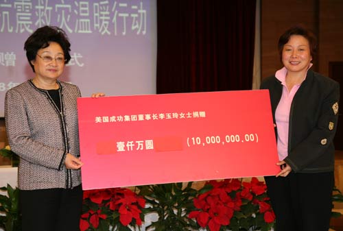 3、美國成功集團董事長李玉玲捐贈1000萬元人民幣;