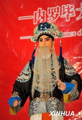 10月12日,在肯尼亞首都內(nèi)羅畢,一名來自北京理工大學(xué)的大學(xué)生在聯(lián)歡會(huì)上表演京劇。當(dāng)天,200多名來自北京理工大學(xué)、內(nèi)羅畢大學(xué)孔子學(xué)院和津巴布韋大學(xué)孔子學(xué)院的大學(xué)生們?cè)趦?nèi)羅畢大學(xué)舉行聯(lián)歡會(huì),同學(xué)們以合唱、舞蹈等精彩的節(jié)目交流情感傳遞友誼。(新華社/徐速繪 攝)