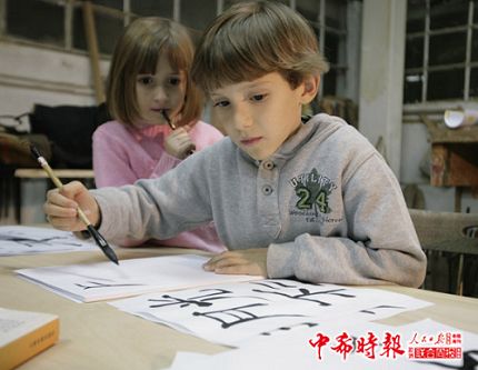 這展覽名為“無盡的航程(三)”,是畫家同題展覽的第三段航程,前兩次的航程是在歐洲,這一段的航程是到達中國。這是一次一個希臘家庭和中國之間的故事,畫家的妻子瓦西里琪參與著整個畫展的準備、設計工作,畫家的兒子迪雅芒蒂斯、女兒安娜絲塔西婭在嘗試著用中國的毛筆來書寫“床前明明月光”的詩句,畫家第一次手執毛筆,書寫了五百多字的漢字書法,然后用斧鑿工具一筆一劃地陽刻在這艘長達十米多的大船之上。