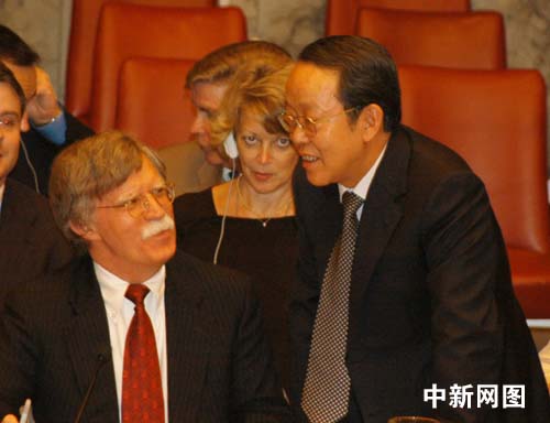 聯合國安理會2006年7月15日下午以15個成員國一致贊成的方式通過了關于朝鮮試射導彈問題的第1695號決議。圖為中國常駐聯合國代表王光亞與美國常駐聯合國代表博爾頓在會議上交流。劉小青 攝